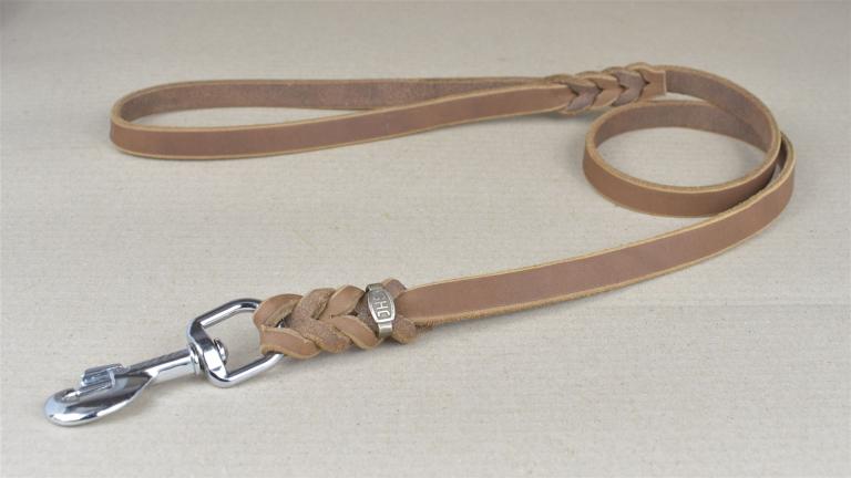 Hundeleineaus Fettleder mit eingeflochtenem Karabinerhaken und Handschlaufe.